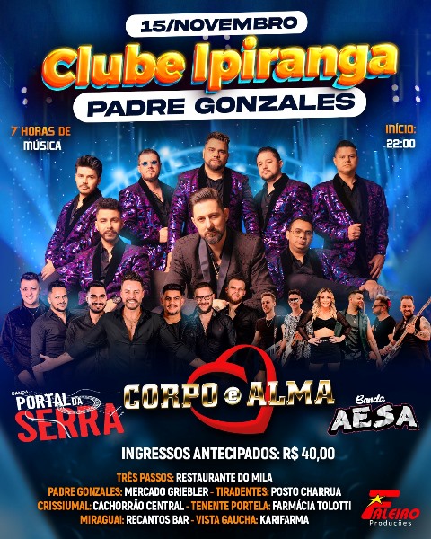 Super baile em Padre Gonzales - Três Passos, com Portal da Serra, Corpo & Alma e banda Aesa, no dia 15 de novembro, com início às 22 horas e com 07 horas de música.