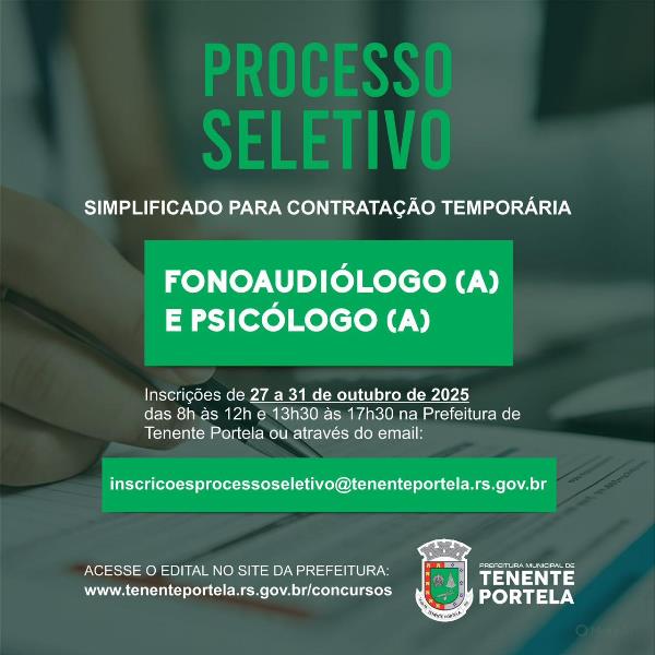 A Prefeitura de Tenente Portela está com inscrições abertas para a formação de cadastro reserva destinado a eventuais contratações temporárias nas funções de Psicólogo(a) e Fonoaudiólogo(a).