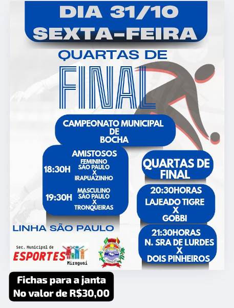 A Secretaria Municipal de Esportes de Miraguai promove nesta sexta-feira (31), a quarta rodada do Campeonato Municipal de Bocha na localidade de Linha São Paulo – Miraguai.