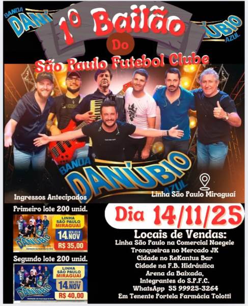 VENHA PARTICIPAR. 04 HORAS DE MÚSICA, SEGURANÇA E ESTACIONAMENTO. INGRESSOS ANTECIPADOS DO PRIMEIRO LOTE A 35 REAIS E DO SEGUNDO LOTE 40 REAIS À VENDA NA COMERCIAL NAEGELE, MERCADO JK, ARENA DA BAIXADA, FB HIDRÁULICA E ELÉTRICA, REKANTUS BAR, INTEGRANTES DA EQUIPE DO SÃO PAULO E PELO 9 99 25 32 64 E NA FARMACIA TOLOTTI EM PORTELA.