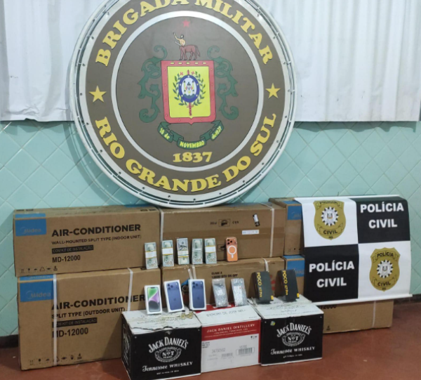 Após abordagem do veiculo GM astra, foram localizados e apreendidos três ar condicionados, 36 unidades de whisky, oito smartphones e duas ampolas de propionato de drostanolona, além de 50 mil dólares em espécie.