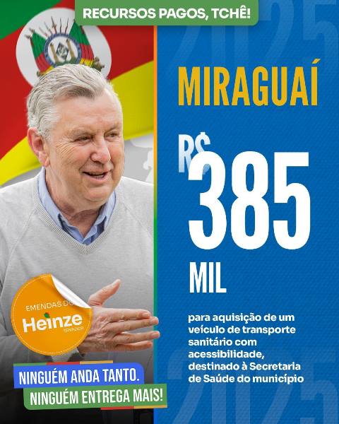 O Senador Luis Carlos Heinze (PP) destina 385 mil para Miraguaí. O recurso é proveniente do Orçamento Geral da União (OGU) de 2025, e será aplicado na estruturação da rede de serviços de Atenção Primária à Saúde local, especificamente para a aquisição de um veículo sanitário acessível.