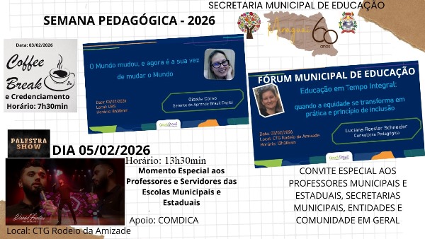 A Secretaria Municipal de Educação e Cultura de Miraguaí (SMEC) dará início ao ano letivo de 2026 com a realização da Semana Pedagógica, um momento fundamental de acolhimento, reflexão, planejamento e formação continuada dos profissionais da educação.
