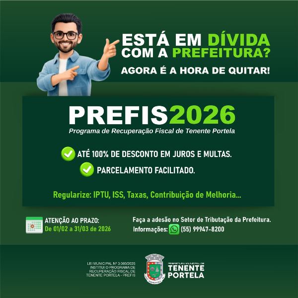 A Prefeitura de Tenente Portela, por meio da Lei Municipal nº 3.089, de 17 de dezembro de 2025, instituiu o Programa de Recuperação Fiscal, o PREFIS. A iniciativa oferece condições facilitadas para que contribuintes, pessoas físicas e jurídicas, quitem seus débitos municipais, com a arrecadação revertida em obras e serviços para a comunidade.