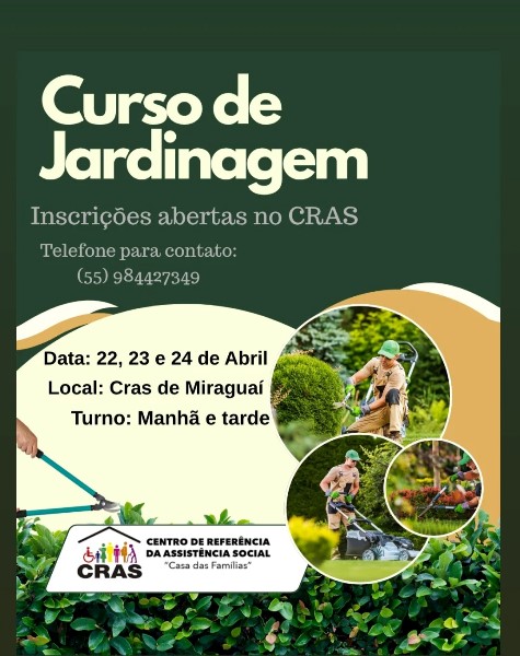 CRAS de Miraguai está com inscrições abertas para o curso de jardinagem a ser realizado nos dias 22, 23 e 24 de abril, pela manhã e tarde.