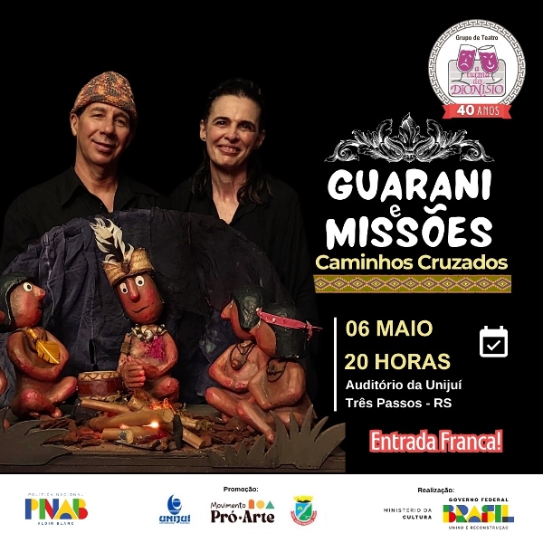 ENTRADA FRANCA - na noite de 6 de maio (quarta-feira), às 20h, no auditório da UNIJUI Campus Três Passos, o Teatro A Turma do Dionísio apresenta o espetáculo teatral GUARANI E MISSÕES – Caminhos Cruzados, que aborda o tema da História das Missões, a vida dos indígenas antes do contato com o branco; o contato com os jesuítas; a fundação das Reduções; a Construção da Igreja, o Tratado de Madrid e suas consequências na vida (ou morte) das populações indígenas.