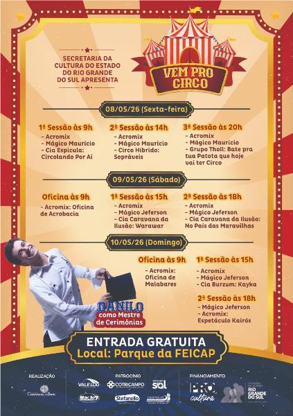 De 08 a 10 de maio, a Arena de Shows da FEICAP, em Três Passos, recebe o projeto “Vem pro Circo!”, com uma programação gratuita voltada a toda a família. O evento reúne espetáculos, intervenções artísticas e oficinas que exploram diferentes linguagens do universo circense.