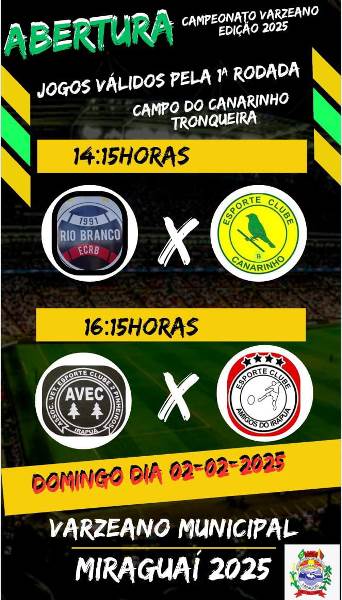 A Administração Municipal de Miraguaí, através da secretaria municipal de Esportes, convida a todos para a abertura do Campeonato Municipal Varzeano, no domingo, dia 02 de fevereiro, em Tronqueiras.