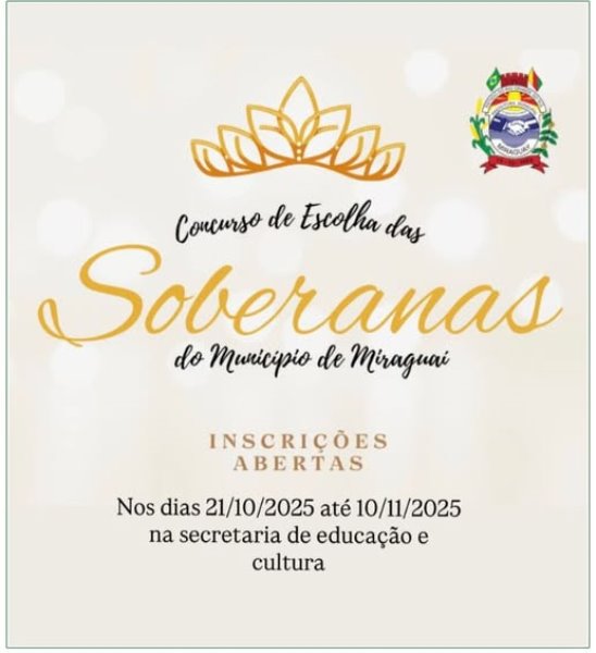 A Administração Municipal de Miraguai por meio da secretaria municipal de Educação e Cultura (SMEC), abriu edital de inscrições para o concurso de escolha das Soberanas do Município.