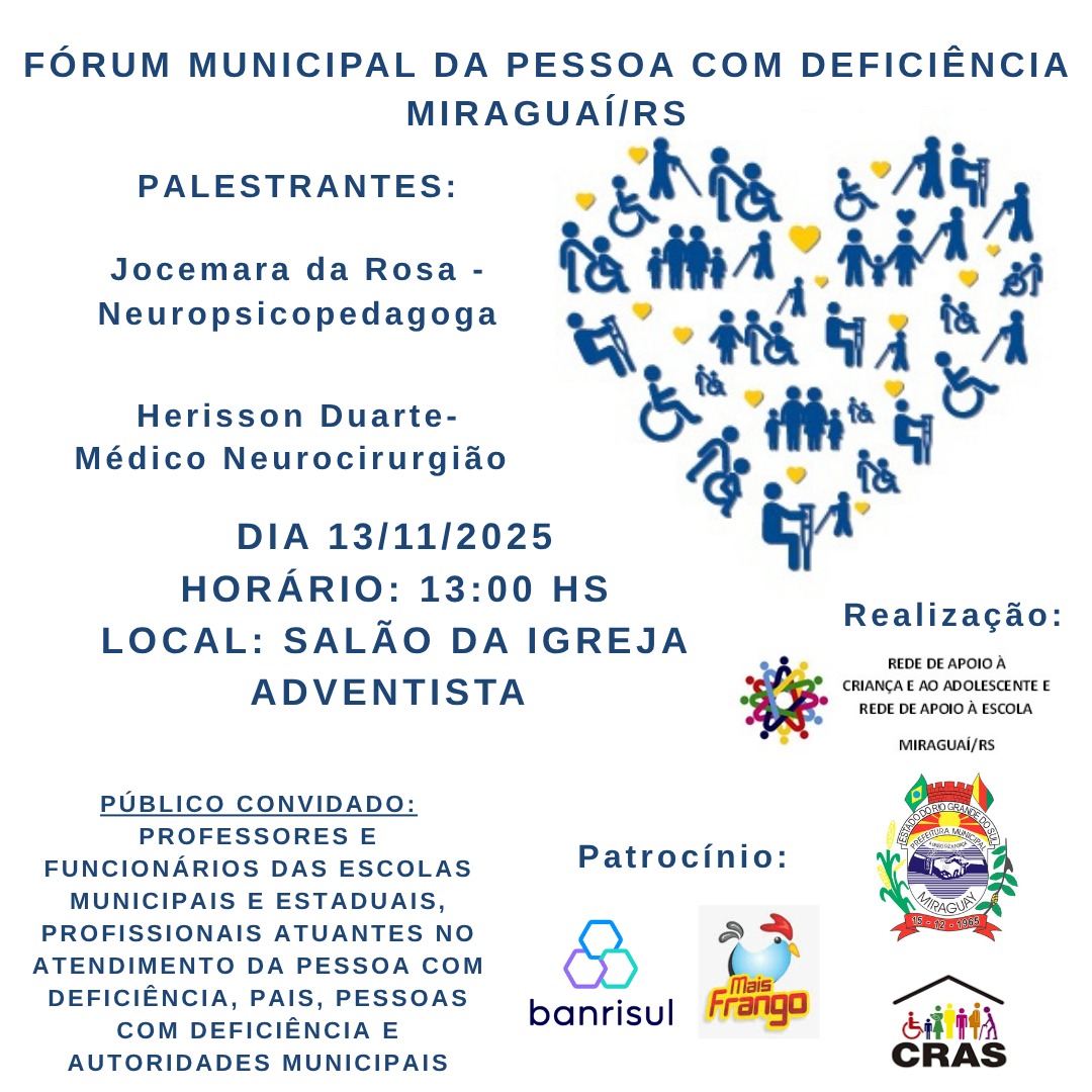 O Fórum Municipal da Pessoa com Deficiência é uma iniciativa da Rede de Apoio à Criança e ao Adolescente em conjunto com o Centro de Referência da Assistência Social e a Administração Municipal de Miraguaí.