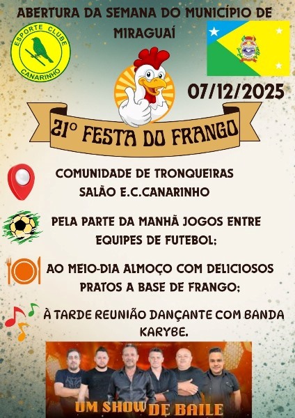 Fazendo parte da abertura da semana do município, será realizada no dia 07 de dezembro, domingo, a 21ª Festa do Frango, não salão do Canarinho na comunidade de Tronqueiras – Miraguaí.