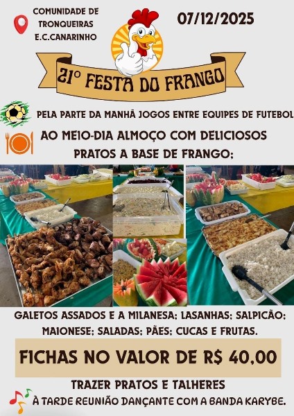 Fazendo parte das festividades dos 60 anos de emancipação política do Município, será realizada 21ª edição da Festa do Frango no próximo domingo, dia 07/12, na sede do Esporte Clube Canarinho de Tronqueiras, Miraguaí.