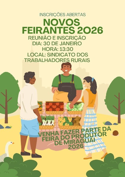 A direção da Feira informa aos novos interessados em participar na Feira do Produtor, que compareçam no encontro que serão aceitos produtores rurais para o ano de 2026.