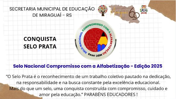 O Município de Miraguaí, através da Secretaria Municipal de Educação e Cultura (SMEC), vai receber o Selo Prata.