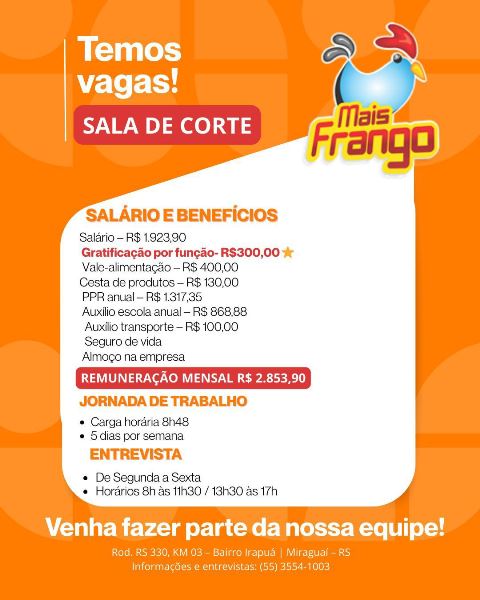 VAGAS DE EMPREGO NA MAIS FRANGO DE MIRAGUAÍ