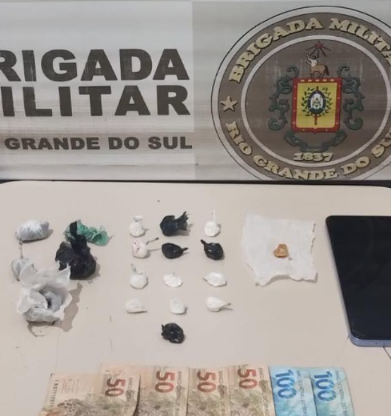 Na revista pessoal foram localizadas 13 porções de cocaína (7,8 g), uma porção de crack (0,9g) e cinco porções de maconha (10,3 g), além de uma quantia em dinheiro e um smartphone.