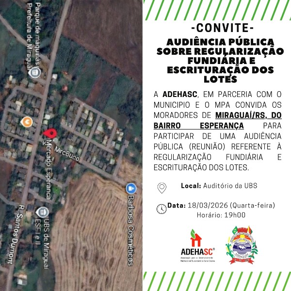 A ADEHASC - Associação para o Desenvolvimento Habitacional Sustentável de Santa Catarina, em parceria com o município de Miraguaí e o MPA, convida os moradores do bairro Esperança para participar de uma Audiência Pública de regularização fundiária e escrituração dos lotes por meio da Lei Federal nº 13.465/17- REURB.