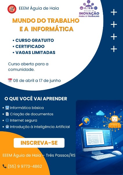 A Escola Estadual de Ensino Médio Águia de Haia, de Três Passos/RS, está com inscrições abertas para o curso “Mundo do Trabalho e Informática”, uma oportunidade gratuita e acessível para toda a comunidade ampliar conhecimentos e se preparar para o mercado de trabalho.