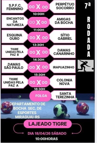 A Secretaria Municipal de Esportes de Miraguaío, vai realizar neste sábado, dia 18 de abril, rodada do Campeonato Municipal de Bocha Feminino, com mando da equipe Unidas Pela Paz, na comunidade de Lajeado Tigre.